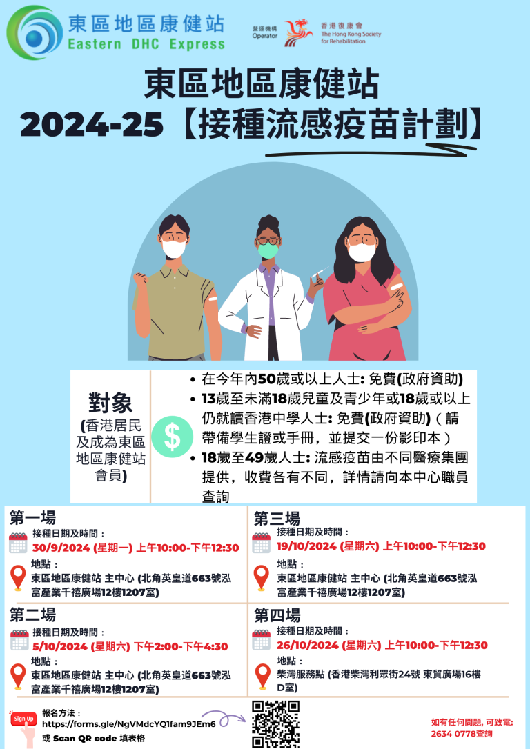 冬季流感高峰期將至, 接種流感疫苗可以有效減低出現嚴重併發症和死亡, 一般可減少住院可能性及留院時間, 因此我哋東區地區康健站將於今年9- 10月為合資格人士免費接種流感疫苗😊💉。