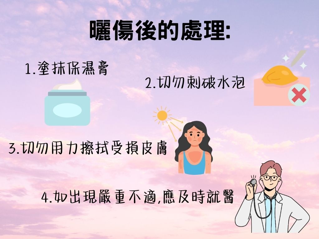 立即減少曝曬,並塗抹保濕膏來緩解灼熱感和疼痛。