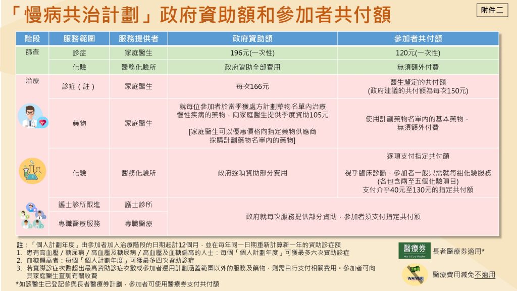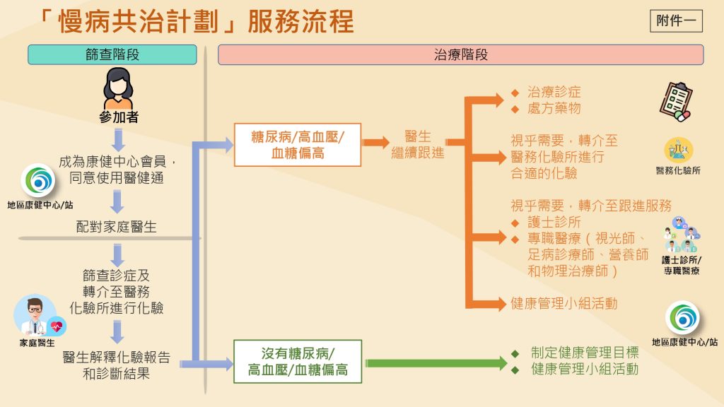 「慢性疾病共同治理先導計劃」(「慢病共治計劃」)詳情。計劃將於十一月中推出,合資格人士在政府資助下,可自行挑選家庭醫生為他們進行篩查,並在診斷出有血糖偏高、患上糖尿病或高血壓後,由家庭醫生繼續為其診治和按臨床診斷處方藥物作長期跟進。