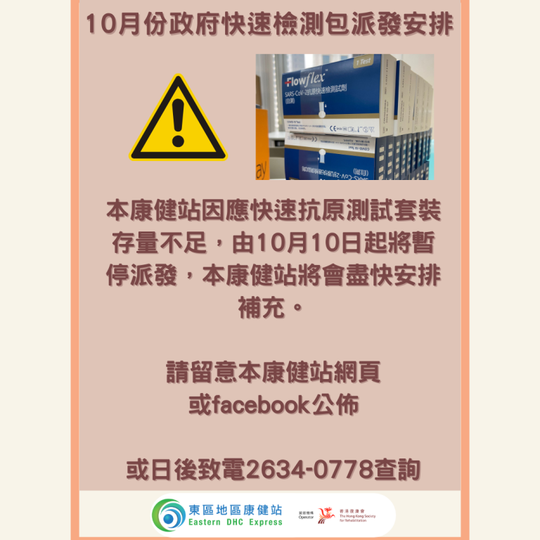 本康健站因應快速抗原測試套裝存量不足,由10月10日起將暫停派發,本康健站將會盡快安排補充。不便之處,敬請見諒。