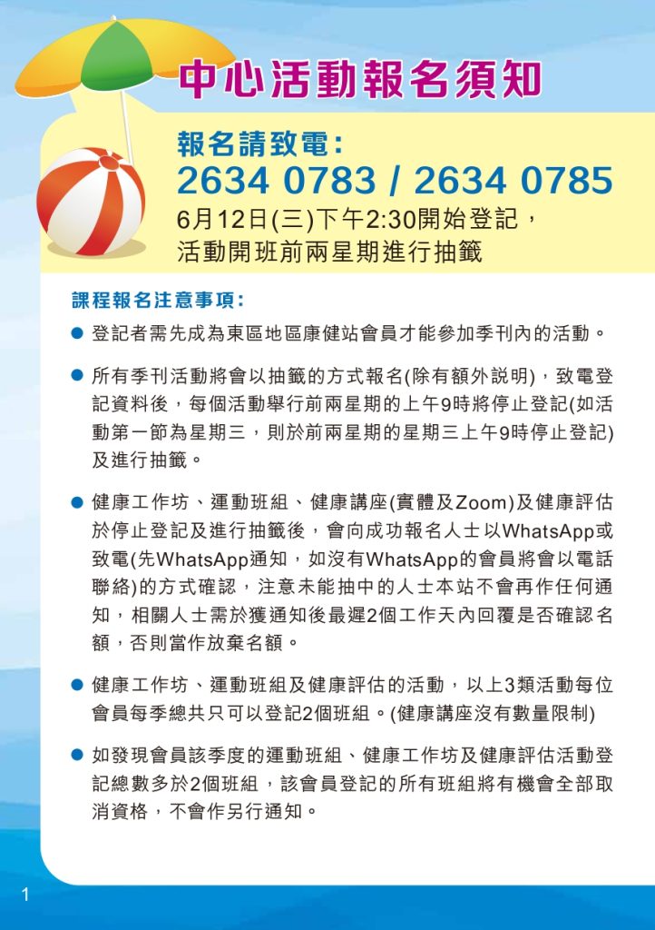 提提大家,今個季度活動報名開始日期係6月12號(星期三)下午2:30開始,記得我哋只接受電話報名(不接受電話留言報名)