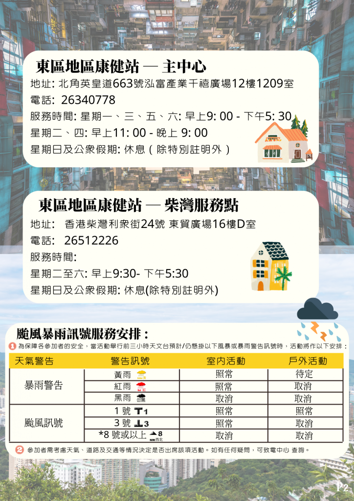 如 未能出席活動,請於活動舉辦前最少兩個工作天通知 康健站職員,以方便職員安排候補填補空缺 如確認名額後缺席或或出席率低於75%,有機會 影響及後報名參與活動的參與資格。