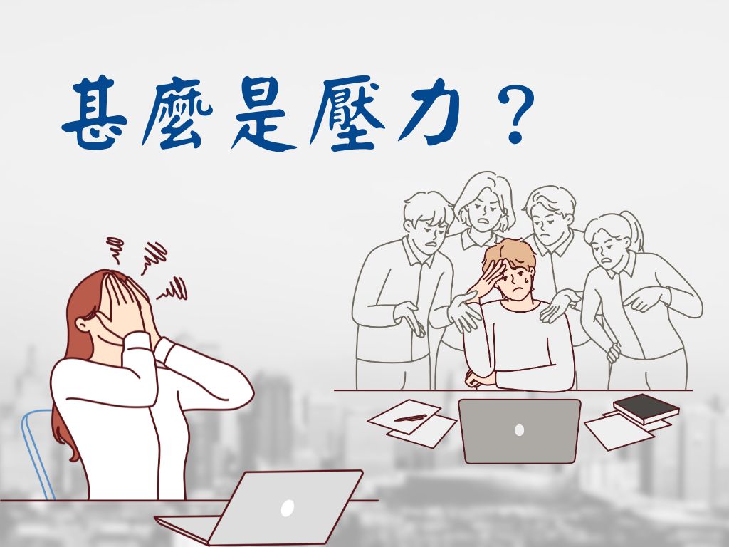 「我很大壓力。」、「壓力令我透唔到氣。」究竟壓力是什麼?壓力是甚麼感覺,大家應該意會得到,但要清楚壓力的定義卻不容易。壓力通常受外在因素影響,列如:一些轉變、困難或挑戰,我們便會感到壓力存在。 然而,壓力在不同人的身上可能會有不同的反應。