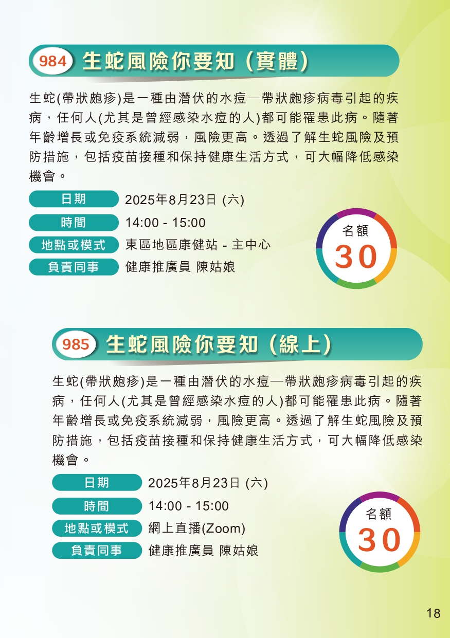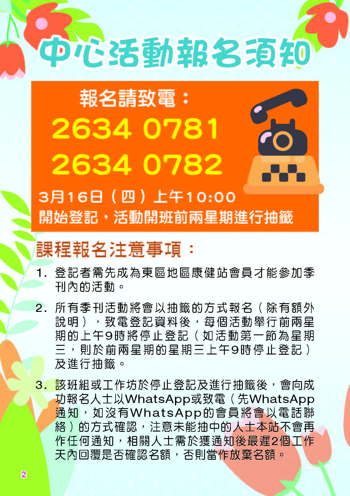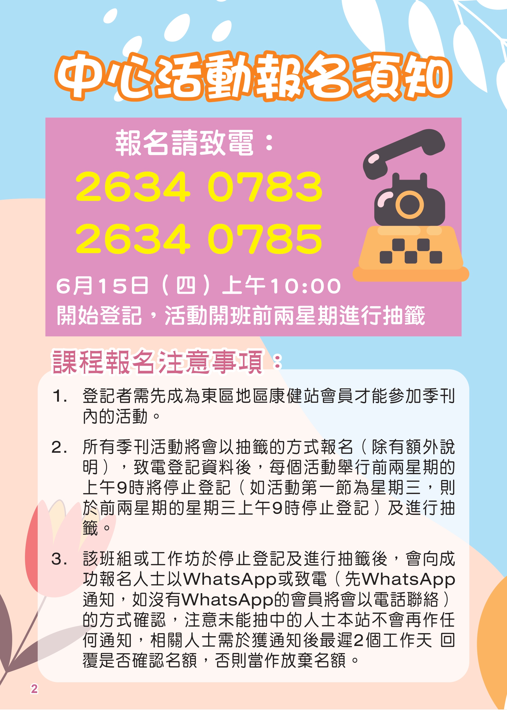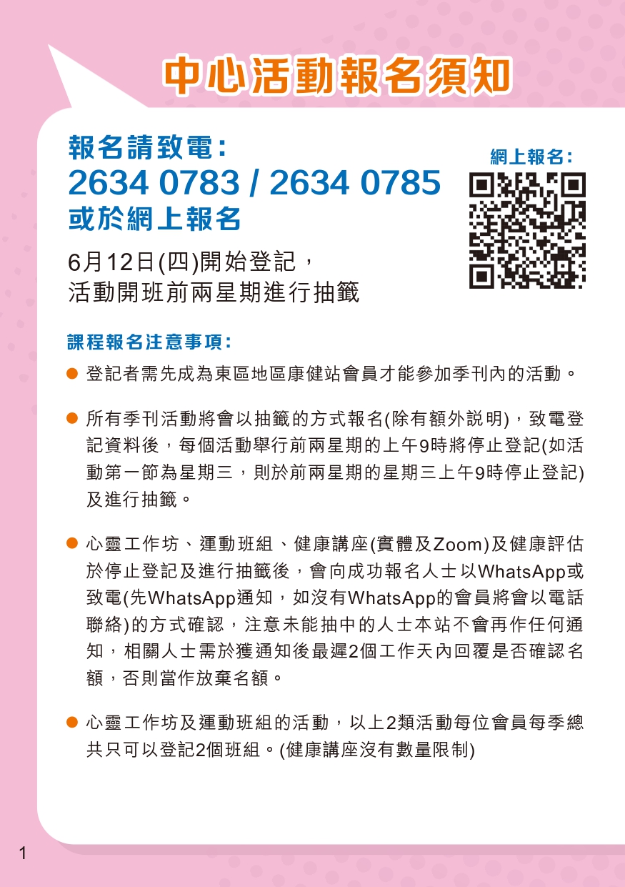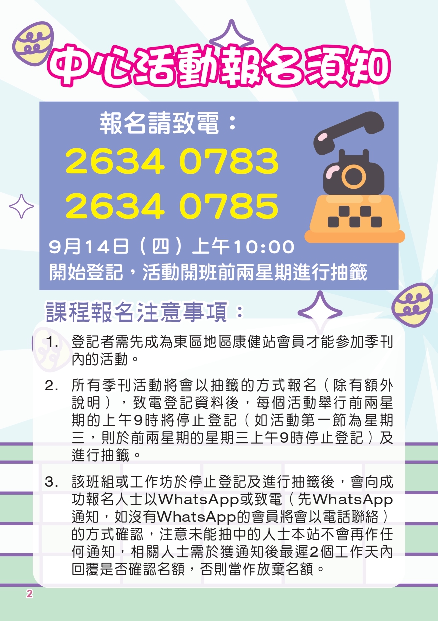 提提大家,今個季度活動報名開始日期係9月11號(星期四)上午11:00開始,你可以選擇電話報名或者線上報名 (不接受電話留言報名)。