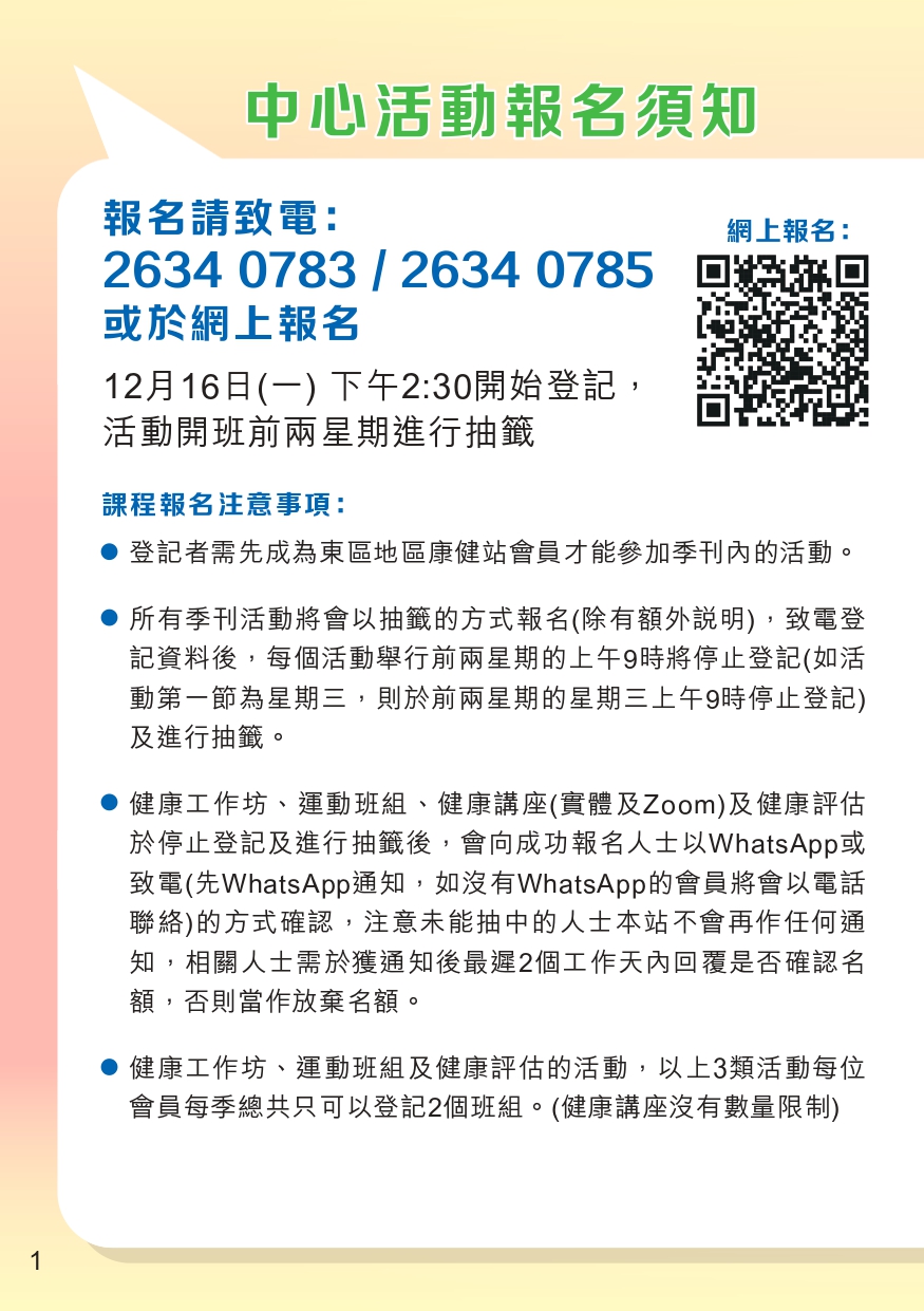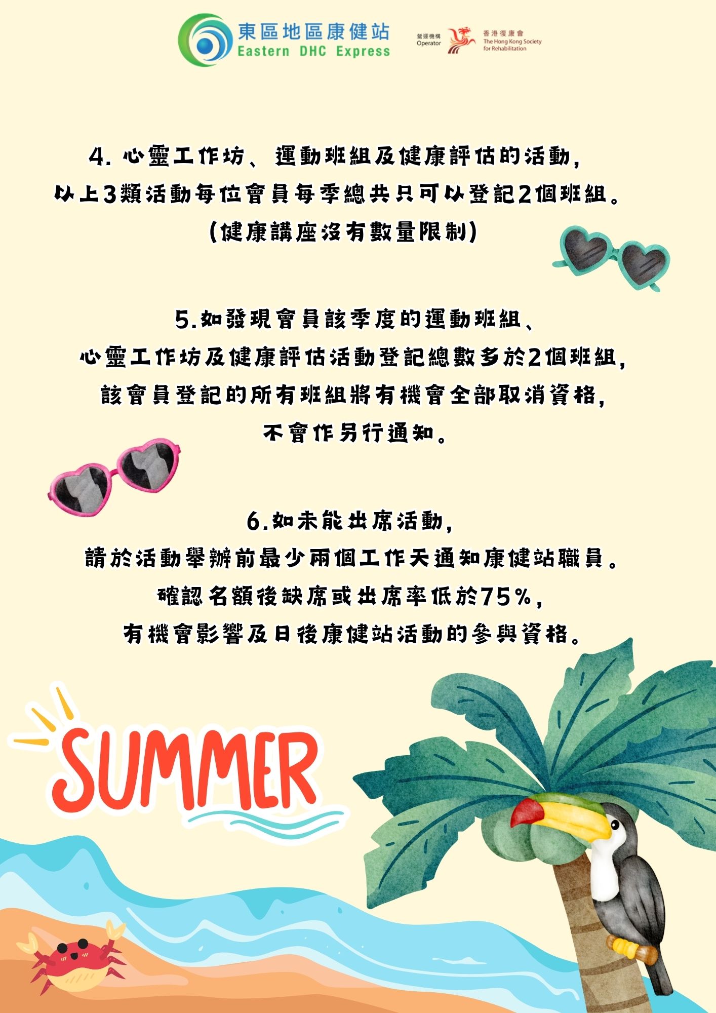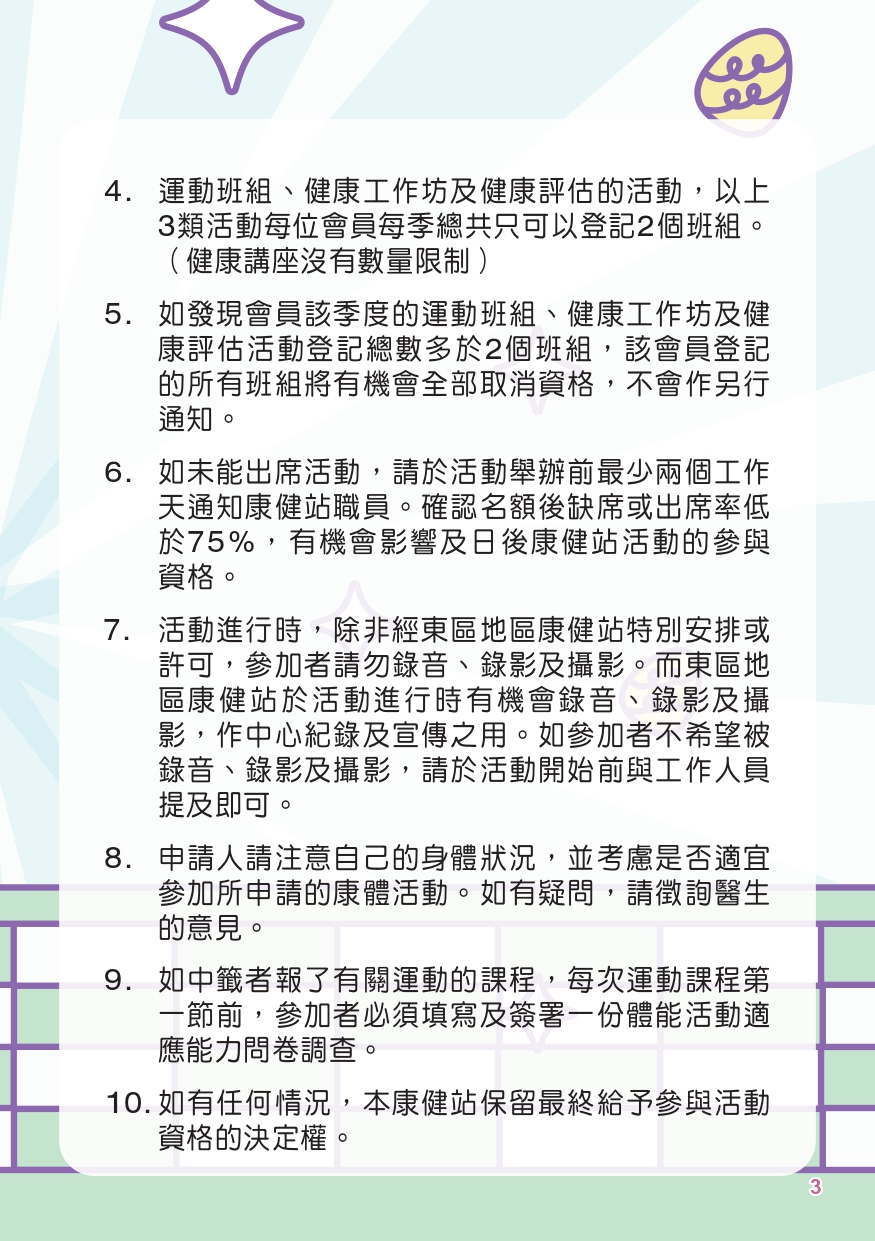 留意如會員於該季度登記運動班組及健康工作坊的總數多於2個(不論報名次數),該會員將有機會取消全部登記,並不會作另行通知。