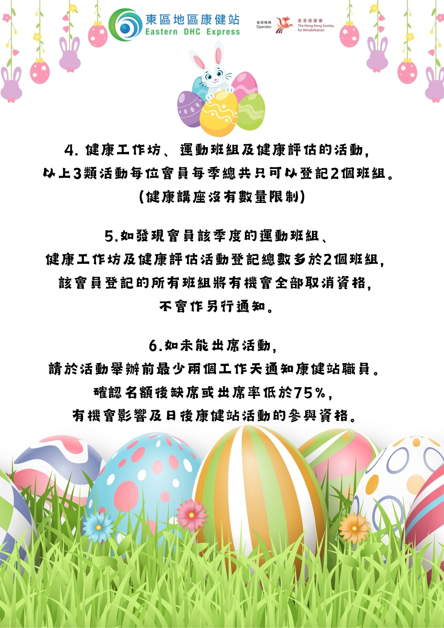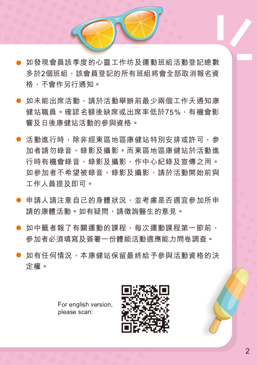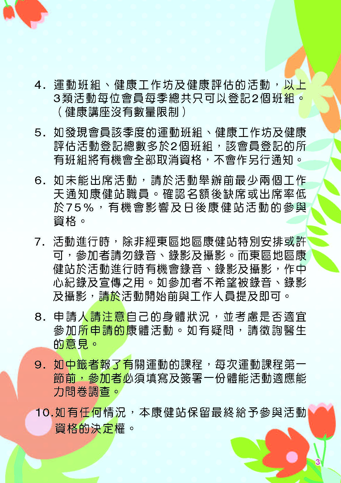 留意如會員於該季度登記運動班組及健康工作坊的總數多於2個(不論報名次數),該會員將有機會取消全部登記,並不會作另行通知。