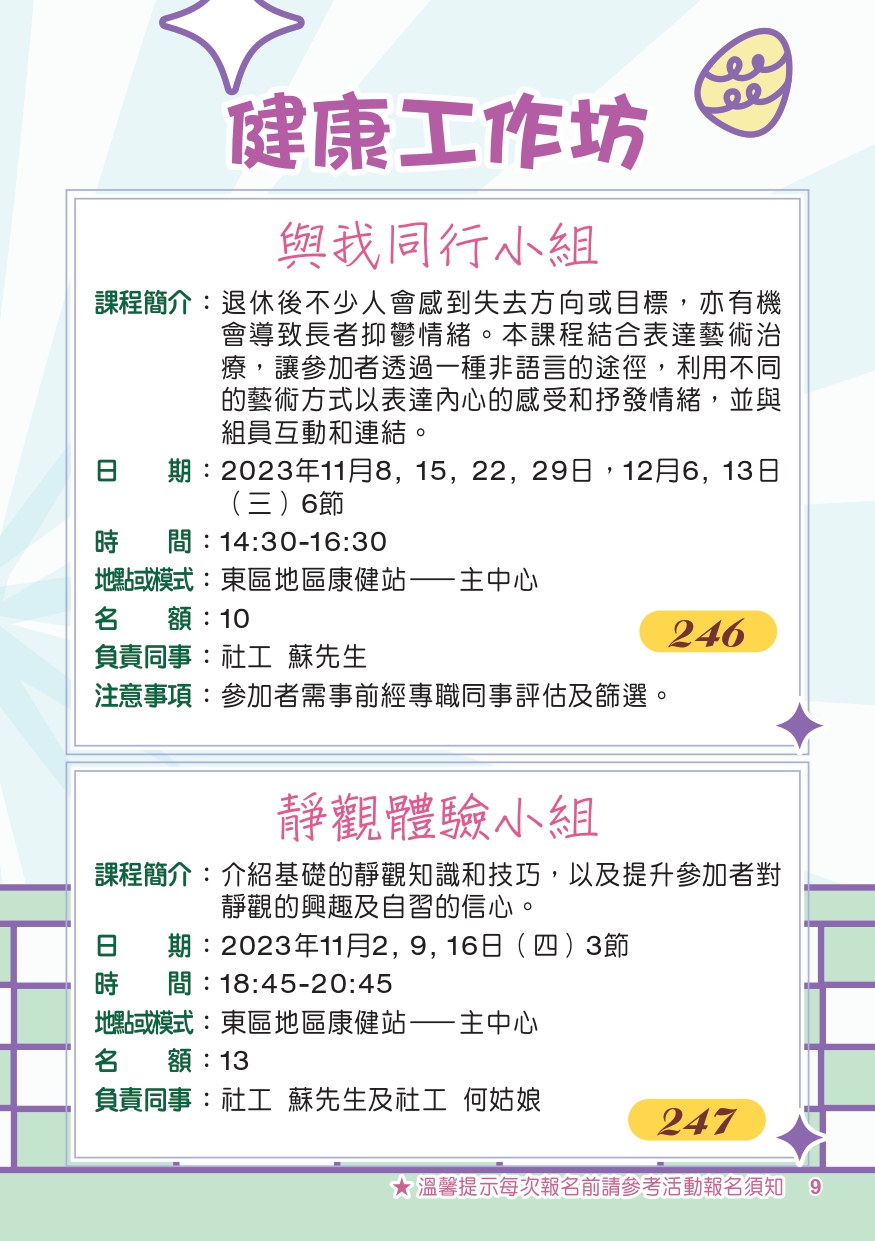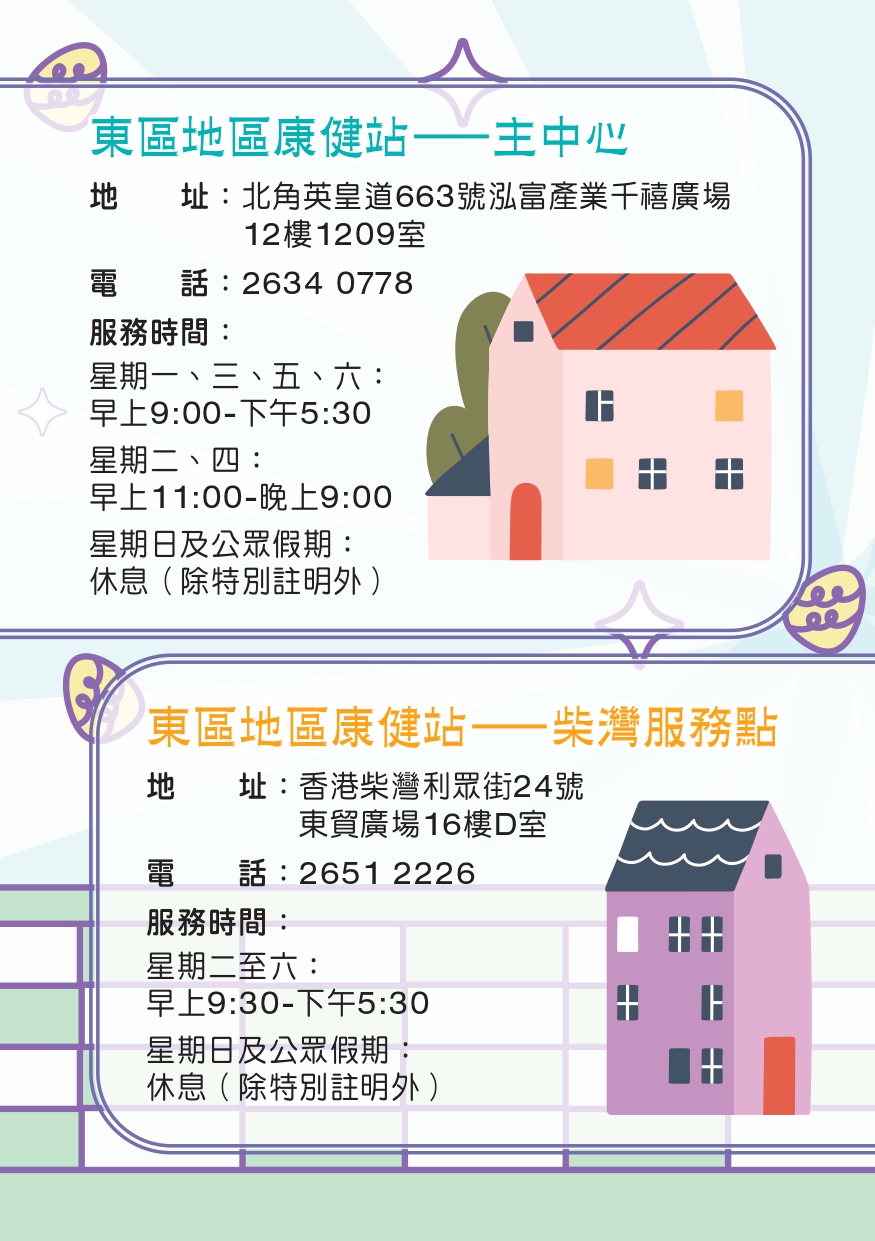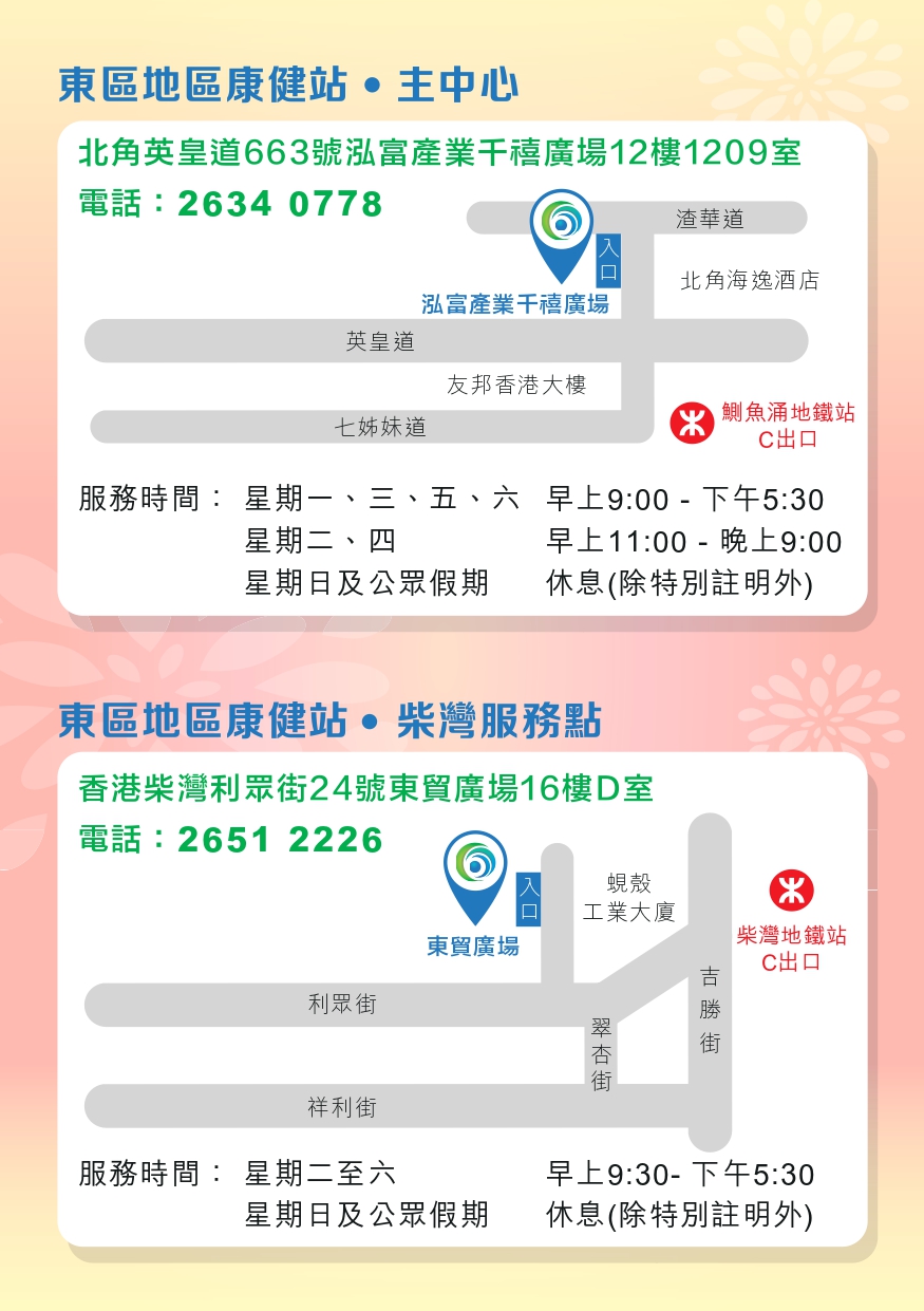 想掌握最新服務擴充資訊!敬請留意東區地區康健站網站或Facebook更新!